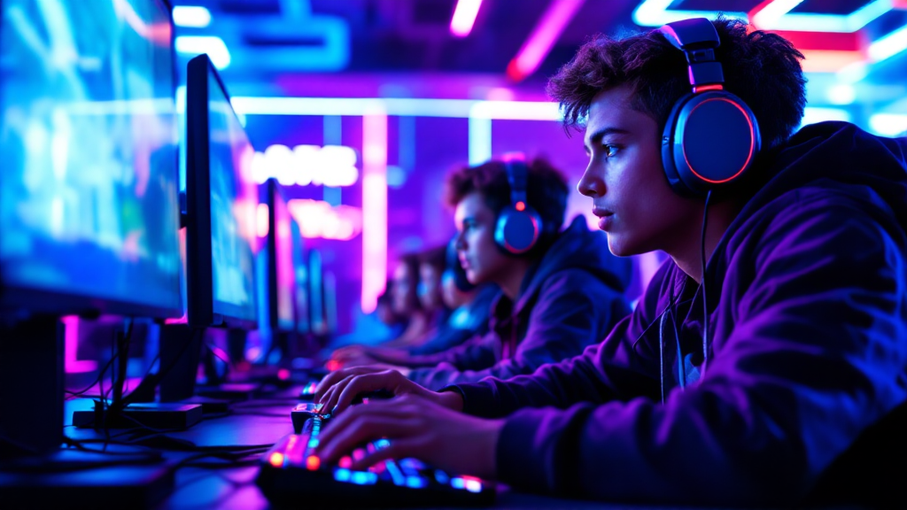 Drone racing goggles, esports controller hands, vibrant LED-lit team event