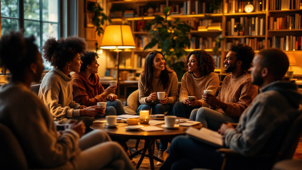 Soft photo of a poetry reading, book club, or someone journaling with a coffee